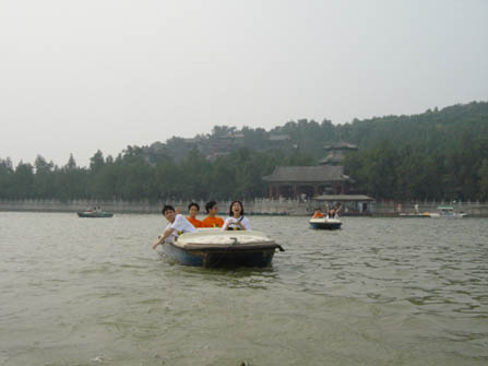 佳人在側(cè),泛舟昆明湖上,想當年多少才子佳人,王孫貴族,金枝玉葉,花前月下,多浪漫的事啊……可如今,看他們這樣的情景,哪是泛舟,呵呵,該叫飚舟才對,哈哈。