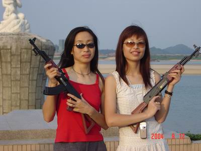 是驚訝?是驚奇?還是驚嚇?原來商科的MM戴上墨鏡,挎上個塑料槍,擺個酷POSE也可以這樣的!如果來個AK-47后果會怎樣~~~