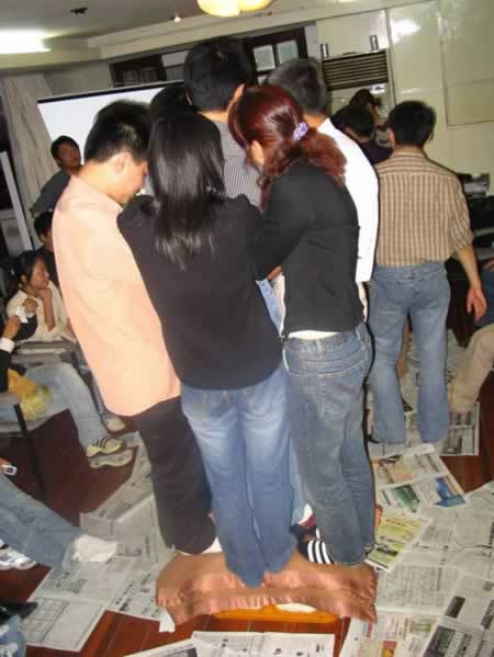 “抱團打天下”游戲:7人合力站在小小的啤酒箱上,堅持1分鐘以上才算過關(guān)。此游戲可以訓練團隊合作精神,考驗意志力和增強組員的相互協(xié)調(diào)與團結(jié)能力。