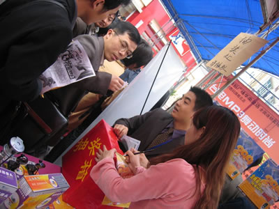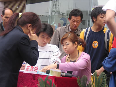 排隊(duì)簽到,不過這位小姐昨晚可能睡得不太好哦