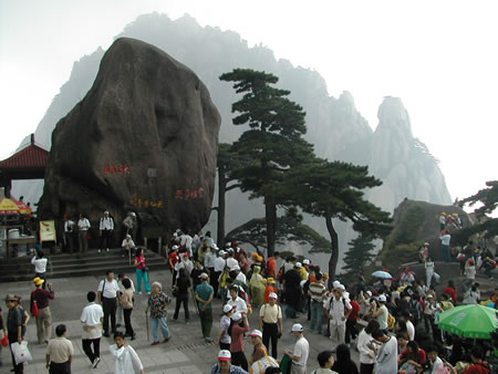 為了節(jié)省體力,大家一同坐纜車(chē)到達(dá)了玉屏峰,此峰可真是人山人海,寸步難移。圖中的松樹(shù),既是大名鼎鼎的迎客松了。