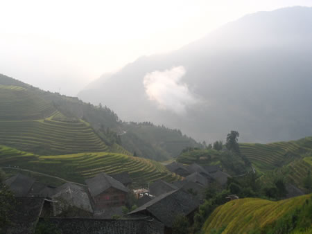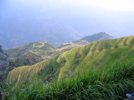 龍勝的梯田風(fēng)光乃世界又一大景觀,春夏秋冬其景觀各不相異.在這金秋時節(jié),整個梯田山上金黃的麥穗一片,形成一片浩瀚的海濤景色圖.經(jīng)過4個半的車程&1個鐘的攀越,終于將龍勝梯田秋之景一覽于腳下.