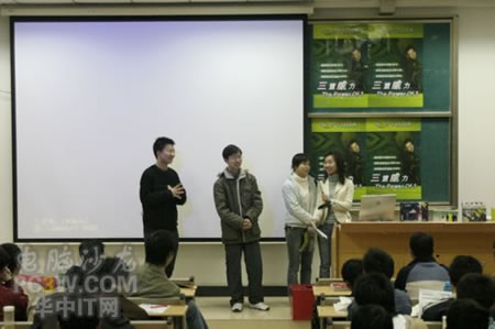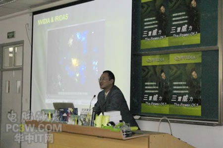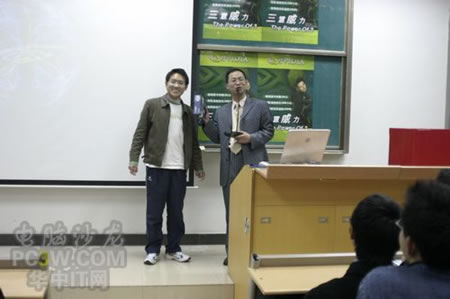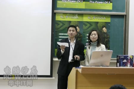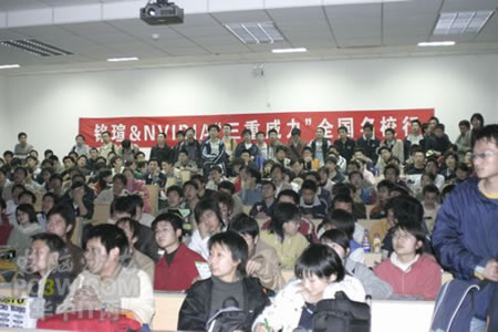 講座首先由商科集團武漢分公司天行電腦的唐平安先生發(fā)言,他首先詳細的向大家解釋了銘瑄NVIDIA“三重威力”的定義。并就“三重威力”的具體內容SM3.0、HDR以及SLI逐一做了詳細的說明,并分析了未來顯卡的發(fā)展趨勢。他生動詳細的演講讓在場的同學們聽得聚精會神,對其產品有著濃厚的興趣。