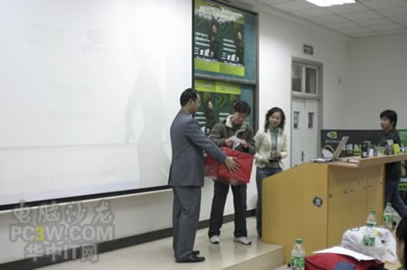 三位成績優(yōu)異的同學高興的結果了這次趣味比賽的獎品——正版游戲軟件、光電鼠標以及DVD刻錄盤片。