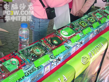 基于SM3.0、HDR以及SLI這三大顯示技術(shù)的GF6系顯卡產(chǎn)品擺滿了整個(gè)產(chǎn)品展示區(qū)的展臺(tái)。從入門級(jí)的6200TC直到最近被各大IT媒體所熱炒的6800GS,展示產(chǎn)品可以說是琳瑯滿目。
