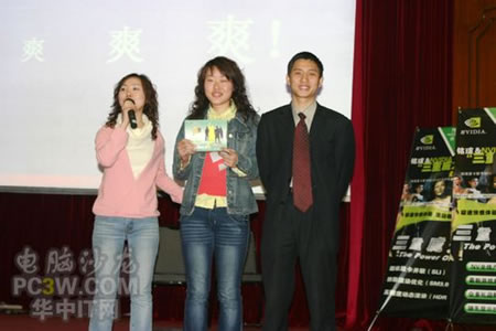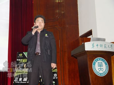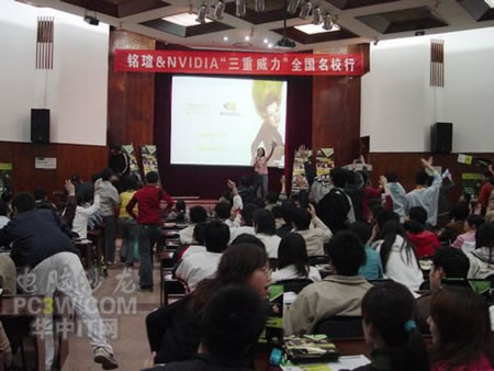 講座首先由商科集團(tuán)武漢分公司天行電腦的甘松先生發(fā)言,他首先詳細(xì)的向大家解釋了銘瑄NVIDIA“三重威力”的定義。并就“三重威力”的具體內(nèi)容SM3.0、HDR以及SLI逐一做了詳細(xì)的說明。他生動(dòng)幽默的演講引來同學(xué)們的陣陣掌聲,會(huì)場氣氛相當(dāng)融洽。