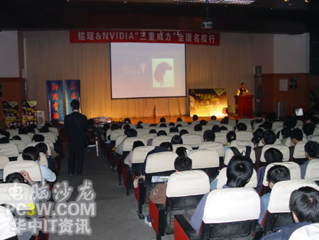 校園行也力圖讓廣大學(xué)生真實(shí)的體驗(yàn)來自NVIDIA的強(qiáng)大新技術(shù)所帶來的震撼效果,特別是SM3.0、HDR以及SLI這三大顯示技術(shù)。產(chǎn)品展臺(tái)上擺滿了各款銘瑄支持這“三重威力”的顯卡產(chǎn)品。從入門級(jí)的6200TC直到最近被各大IT媒體所熱炒的6800GS,展示產(chǎn)品可以說是琳瑯滿目。