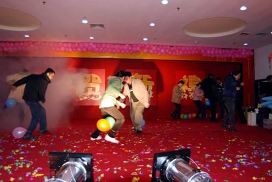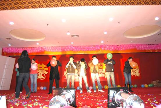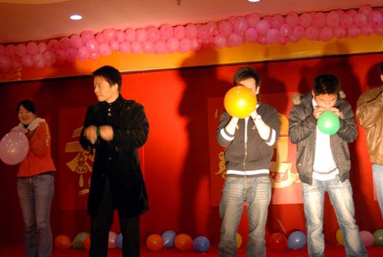 首先請出的是鼠年本命年的幸運(yùn)同事上臺,他們將得到一份精美的禮品,郵票幸運(yùn)封。同時(shí)他們也要參加今天的第一個(gè)游戲節(jié)目,比賽吹氣球。比賽規(guī)則是規(guī)定的時(shí)間內(nèi),誰把氣球吹爆的多,誰就是冠軍。每位參賽者不僅可以得了一份價(jià)值不菲的禮物,獲勝冠軍還有特別的禮物領(lǐng)取。