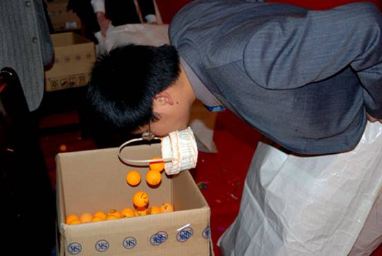 真正考驗(yàn)大家的時(shí)候到了,下一個(gè)游戲項(xiàng)目是運(yùn)球接力賽,主持人宣布每桌派出三名同事上臺,根據(jù)規(guī)定必須用嘴咬住籃子,將小球從舞臺的一邊運(yùn)輸?shù)綄γ嬉贿叺囊巫由,而且必須把自己裝進(jìn)布袋里前進(jìn),這個(gè)難度可真不小!