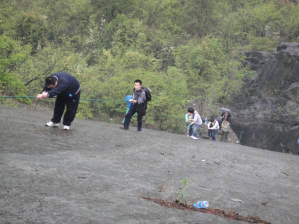 這是紀(jì)龍山有名的豹子崖,坡度有60多度,高3、40米,天上的雨稀里嘩啦,陡峭的崖壁顯得異常險滑。教練建議我們不爬的跟著助教走另外一條路,但我們整個團(tuán)隊50人, 沒有一個放棄的,大家互幫互助的全部爬上了豹子崖!