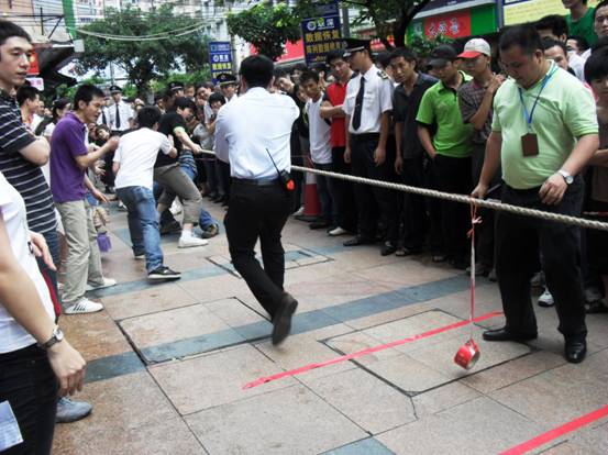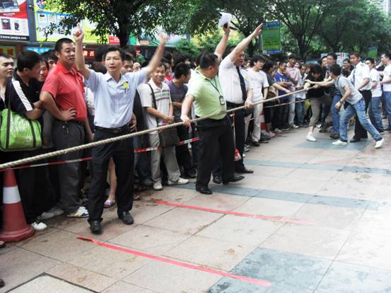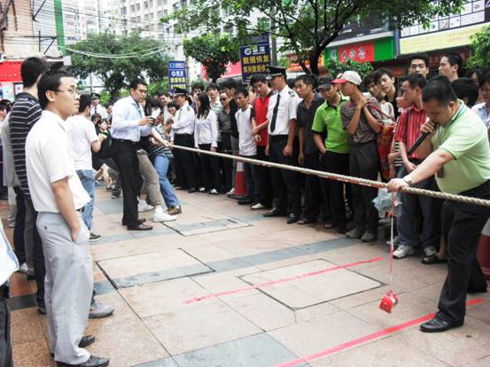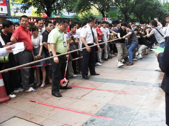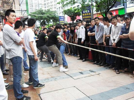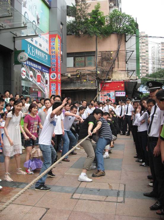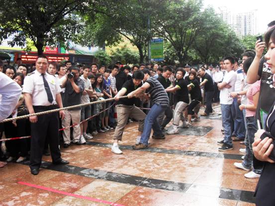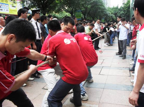 加油加油加油,,隊員們連吃奶的力都使上了,標(biāo)志帶向前移動一下,眼看就要被拉過去了,但每一個人都沒有放棄,使出全身力量,拉拉隊的聲音早就沖過云宵,叫喊聲響成一片,每個人都快瘋掉。只見秦明和盧健華兩位份量級的人物向后一倒,倒在地上,紅色標(biāo)記帶隨著這一拉,越過紅線,大家跳了起來,第一局,贏啦!