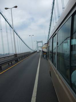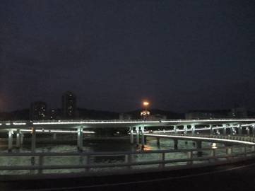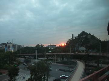 經(jīng)過整整九個(gè)多小時(shí)的長(zhǎng)途跋涉,下午六點(diǎn)多,終于即將到達(dá)我們的第一站,在進(jìn)入市區(qū)的時(shí)候恰巧夕陽西下,一輪紅日慢慢隱沒與橋的那一頭,又一副壯美景觀呈現(xiàn)于眼前。。