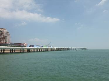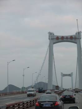 從導(dǎo)游宋小姐口中得知,海滄大橋乃是世界第二,亞洲第一的特大型三跨全漂浮鋼箱梁懸索橋,全長(zhǎng)五千多米(嘿嘿,當(dāng)時(shí)沒記住詳細(xì)數(shù)據(jù),查資料得知全長(zhǎng)5926.527米,主跨648米);大橋的索塔采用門式結(jié)構(gòu),橋柱各部結(jié)構(gòu)采用曲線造型為基調(diào)的設(shè)計(jì)構(gòu)思,型體上線條流暢,輕柔,使大橋本身也為了一座藝術(shù)精品。 遠(yuǎn)遠(yuǎn)望去,銀藍(lán)色的橋體與碧藍(lán)色的天空相輝映,似長(zhǎng)虹如玉帶般橫臥在粼粼的海面上。一條條平行鋼絲索股,掛在門式索塔上,舉目望去行駛的汽車仿佛飛翔在藍(lán)天碧海中,縱橫交錯(cuò),真是美不勝收的畫卷。