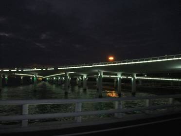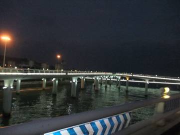 當(dāng)旅行巴士進(jìn)入市區(qū)行至環(huán)島路西段時(shí),一座壯美獨(dú)特的大橋又躍然于眼前。此時(shí),正值華燈初上,遠(yuǎn)遠(yuǎn)看去只見一長(zhǎng)排橋墩呈橢圓型立于水中,空中橋身則為流暢的弧線形,橋上燈火輝煌,橋下波光蕩漾,就如同一條騰出水面的白龍,強(qiáng)烈地震撼著我們的視覺,原來這就是著名的“演武大橋”。