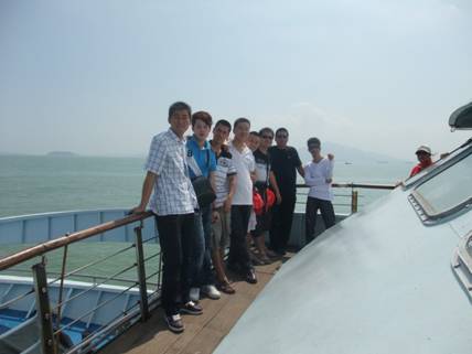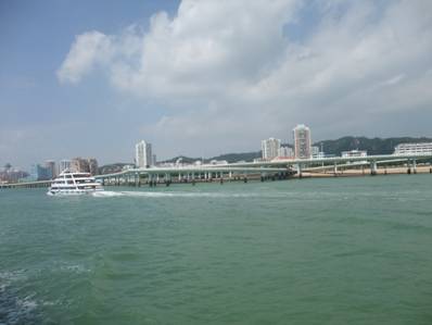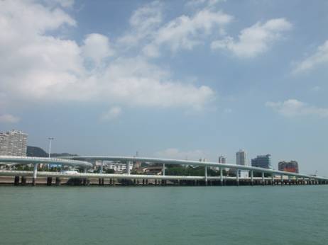 金門島游輪合影 次日,乘坐游輪環(huán)游小金門島再次經(jīng)過演武大橋,立于船頭遙望廈門市區(qū),只見大橋迎面聳立海上,與夜景絕然不同,她與岸同高, 呈S形的路段環(huán)繞著廈門大學(xué)的海景房,流線型的梁體緩緩延伸,波浪似地起伏著;遠(yuǎn)遠(yuǎn)看去,如長(zhǎng)龍臥波,欲騰空而起,細(xì)看時(shí) 又似展翅飛翔的白鷺,躍出水面的白鰭豚,簡(jiǎn)捷流暢的線條,精美靈動(dòng)的造型,給人以強(qiáng)烈的視覺美感。