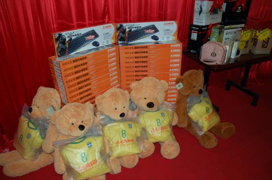 本次晚宴除開幾個(gè)大獎(jiǎng)以外,也特意為到場(chǎng)的每一位經(jīng)銷商朋友準(zhǔn)備了鼓勵(lì)獎(jiǎng),獎(jiǎng)品分別為臺(tái)電U盤。攝像頭。鍵鼠套裝。電影票。抱抱熊等等,作為禮物送給了所有朋友。。