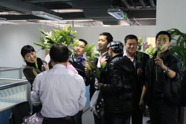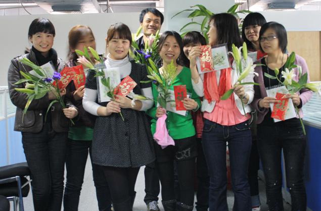 值3月8日來(lái)臨之際, 謹(jǐn)向公司所有女職員致以最美好的祝福! 3月8日,北京分公司為女員工舉辦了一場(chǎng)“美麗綻放,祝福女性”活動(dòng);顒(dòng)中男同事們盡顯紳士風(fēng)采,出色地完成了綠葉的角色。 早上,女同事的辦公桌上都放著公司在她們到來(lái)前準(zhǔn)備好的祝福卡片。看都卡片上溫馨的話語(yǔ),讓女同事們感動(dòng)不已。9:30剛剛到,一大束鮮花就被送到公司辦公室,鮮花的到來(lái)將“美麗綻放,祝福女性”活動(dòng)推向了高潮。寫字樓辦公區(qū)的女同事先進(jìn)行了合影,之后大束鮮花被拆開。行政人事部宣布鮮花派送開始,男同事們便一擁而上地來(lái)取花,搶花的場(chǎng)面真是別開生面。