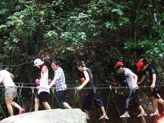 走進(jìn)銀盞谷,第一節(jié)目就是森林溯溪探險(xiǎn),從山腳一路溯溪而上,走獨(dú)木橋穿鐵索沿水流彎彎曲曲到達(dá)山頂,可能急著去漂流一路上走馬觀花然后沿山路而返,進(jìn)行今天最重要的節(jié)目------黃龍峽漂流!