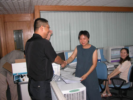 圖中是人事部紀(jì)經(jīng)理代表公司總經(jīng)辦將新購(gòu)買的顯示器親自督促并將移交到有這位準(zhǔn)媽媽的部門。