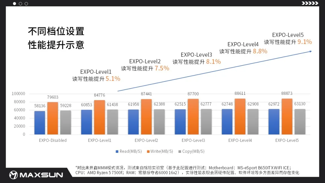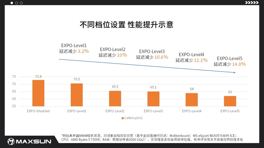 據(jù)銘瑄實(shí)驗(yàn)室實(shí)測(cè),開(kāi)啟MMM模式Level5后對(duì)比未開(kāi)啟MMM模式,讀寫(xiě)性能提升9.1%,延遲減少14.8%,性能提升表現(xiàn)卓越(注:實(shí)際性能表現(xiàn)因硬件配置、軟件環(huán)境等多方面差異而存在變化,因架構(gòu)差異原因,銳龍8000系列不支持該功能)。