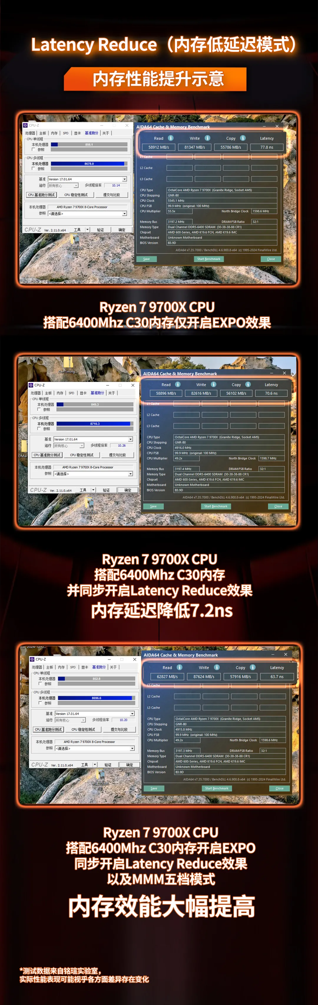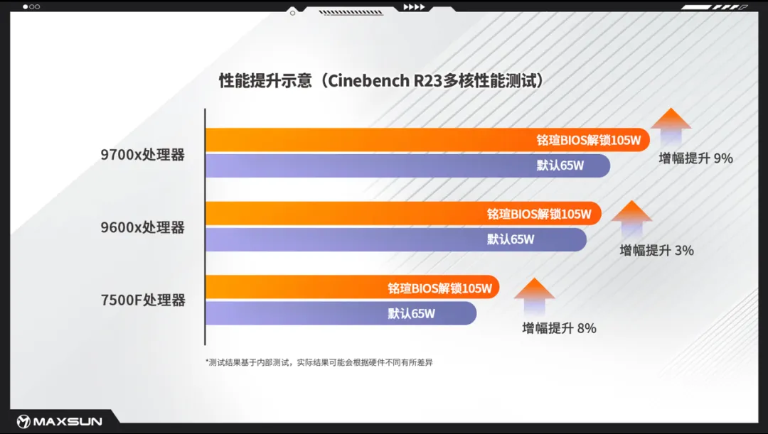 據(jù)銘瑄實(shí)驗(yàn)室實(shí)測(cè)顯示,在開(kāi)啟“65W CPU TURBO TO 105W”模式后,多款A(yù)MD處理器性能皆獲得顯著提升,其中9700X處理器提升最為明顯。