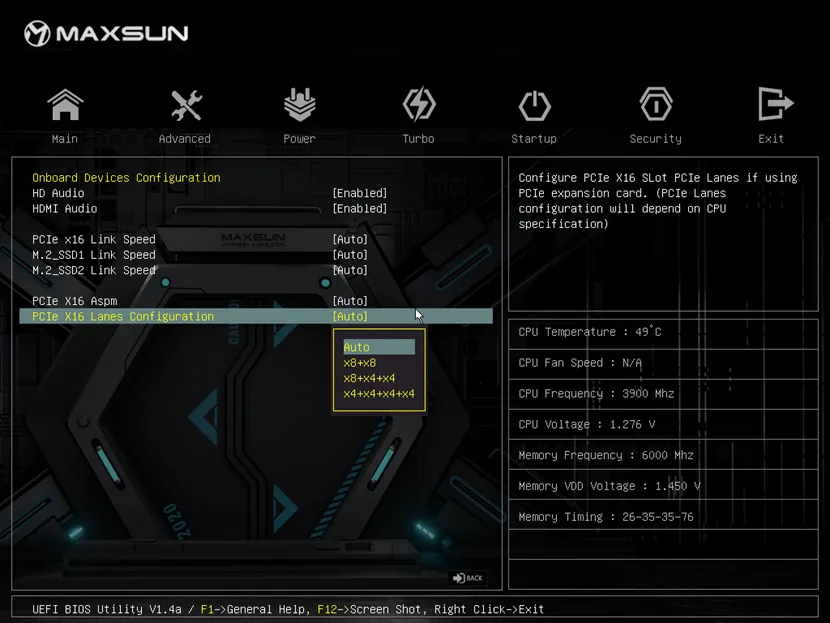AMD B650芯片組提供PCIe 16X通道拆分功能,但大多數(shù)主板只能支持2個(gè)8X拆分,甚至有部分主板不支持此功能,銘瑄在此基礎(chǔ)上進(jìn)行優(yōu)化,提供3個(gè)PCIe 16X通道拆分模式,滿足用戶不同的需求。3個(gè)PCIe 16X通道拆分模式分別為:X8+X8、X8+X4+X4和X4+X4+X4+X4,用戶可通過(guò)BIOS頁(yè)面中Advance(高級(jí))—chipset Configuation(芯片配置)—PCIe X16 Lanes Configuration(PCIe X16通道配置)來(lái)設(shè)置此功能,從而根據(jù)自身需求更好地分配PCIe資源。