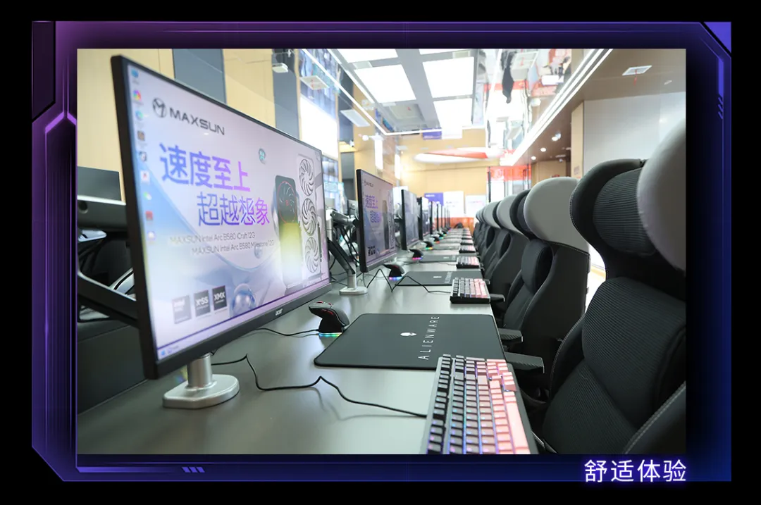 電競館劃分有單人房、雙人房、三人房、八人房等多種競技區(qū),全場共99臺機器,采用銘瑄板卡,包括B760系列主板、Z890系列主板和最新推出的銘瑄Intel Arc B580顯卡。電競館緊跟市場潮流,選擇時興的“3I平臺”(英特爾CPU+英特爾芯片組+英特爾GPU)為玩家提供強悍的性能加持。其中,MS-Challenger Z890M主板 x MAXSUN Intel Arc B580 Milestone 12G x 英特爾®酷睿™Ultra 200S系列處理器的超強搭配可謂最為亮眼。
