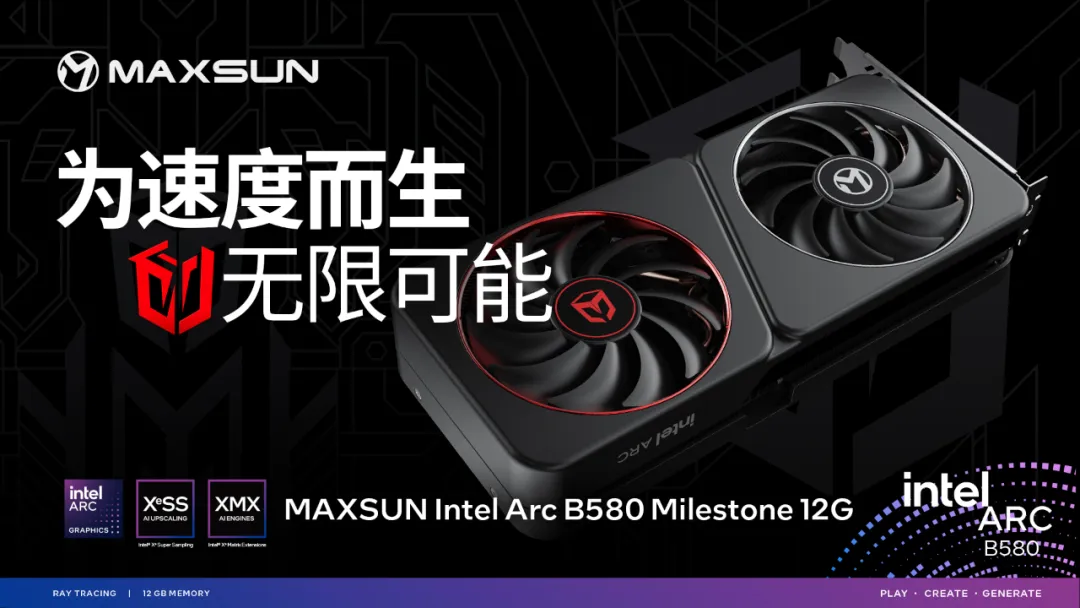 MAXSUN Intel Arc B580 Milestone 12G顯卡,為速度而生,無論是性能、散熱、外觀上都有著出色表現(xiàn)。12GB超大顯存,即使在高負載游戲中都能輕松應(yīng)對。