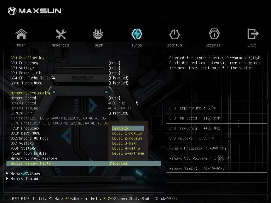 對于許多用戶而言,內(nèi)存超頻可能仍然是一個復(fù)雜的話題。銘瑄全新推出MMM模式,幫助用戶快速實現(xiàn)輕松超頻。針對不同的用戶需求,MMM模式提供Level 1-5共5個檔位,預(yù)設(shè)內(nèi)存優(yōu)化配置,用戶直接選擇則可套用。5個檔位里,檔位越高,性能提升越明顯,但需注意的是同時對硬件體質(zhì)要求也更高,用戶可根據(jù)自身實際情況操作,選擇最適合自身需求的內(nèi)存配置。