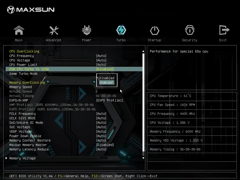 在Turbo頁面找到65W CPU TURBO TO 105W選項,選擇Enable/打開 后按F10保存,重啟后即可生效。