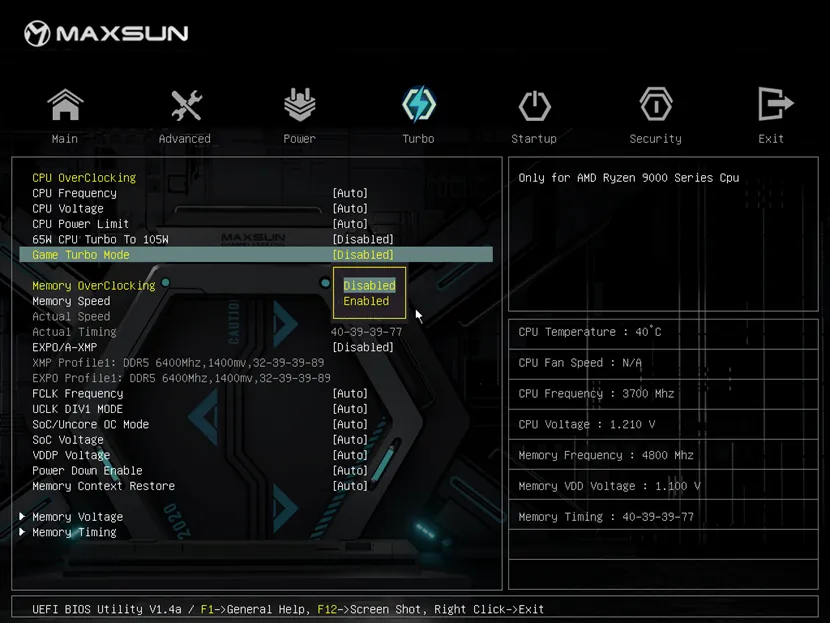 在BIOS頁面中選擇“Game Turbo Mode”,點擊“Enabled”選項來開啟此功能,按F10儲存設(shè)定重新啟動即可享受更流暢、視覺效果更佳的游戲體驗。