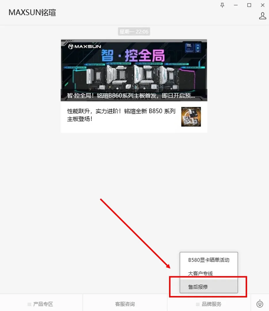 銘瑄始終將用戶體驗放在首位,為了給廣大用戶帶來更加便捷、高效的售后服務(wù)體驗,銘瑄官方公眾號現(xiàn)已支持售后報修功能,幫助用戶輕松解決產(chǎn)品售后問題。當(dāng)用戶需要進行報修時,只需點擊銘瑄公眾號右下方【品牌服務(wù)】欄目,選擇【售后報修】即可進入報修小程序。