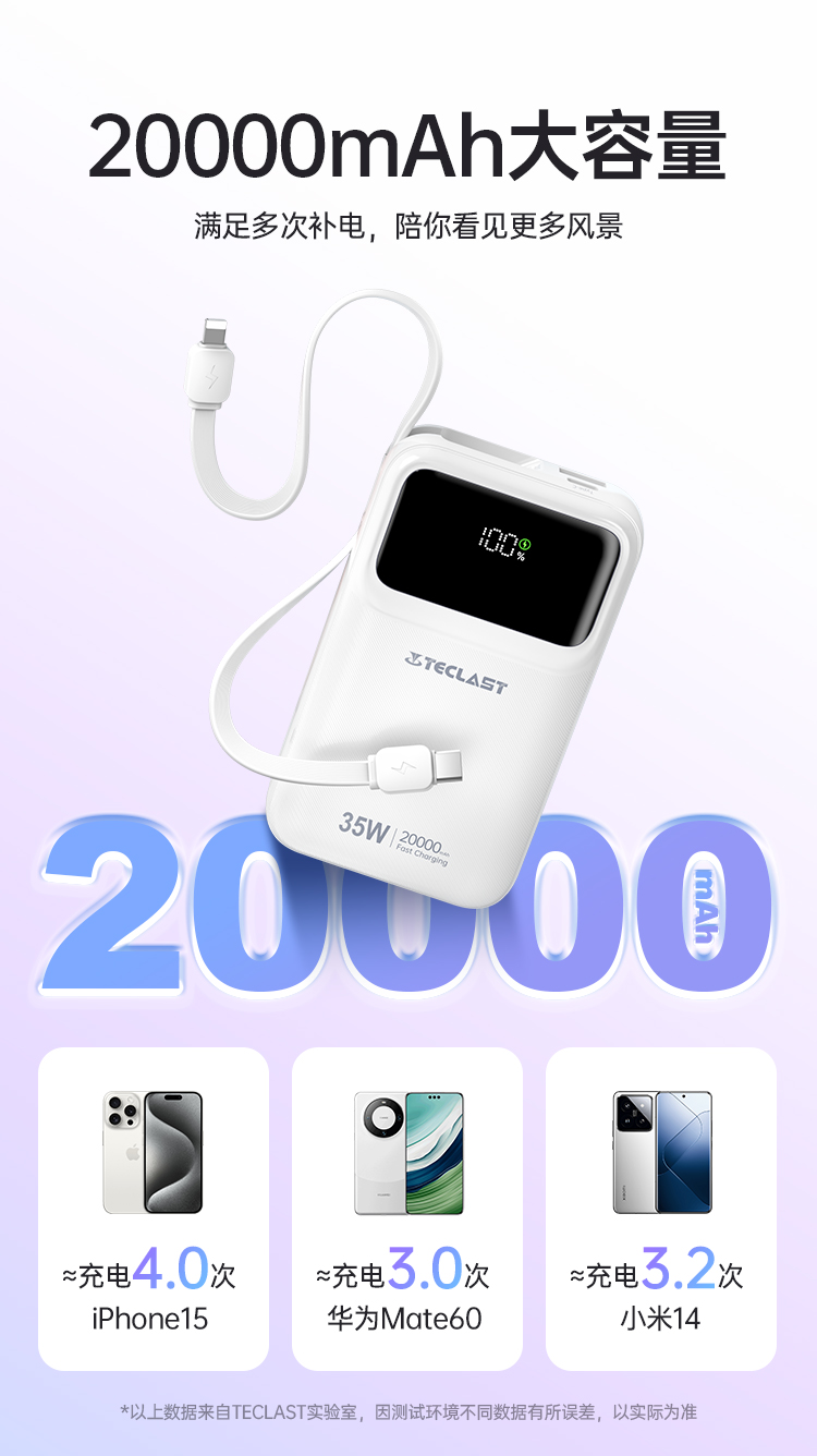 如今,臺電Teclast洞察到消費者對充電速度的需求,重磅推出一款35W高功率輸出的充電寶,不僅能夠滿足蘋果手機用戶的快充需求,更以20000mAh的大容量和自帶雙線快充以及數字顯示屏等眾多優(yōu)勢,成為了眾多用戶的首選。