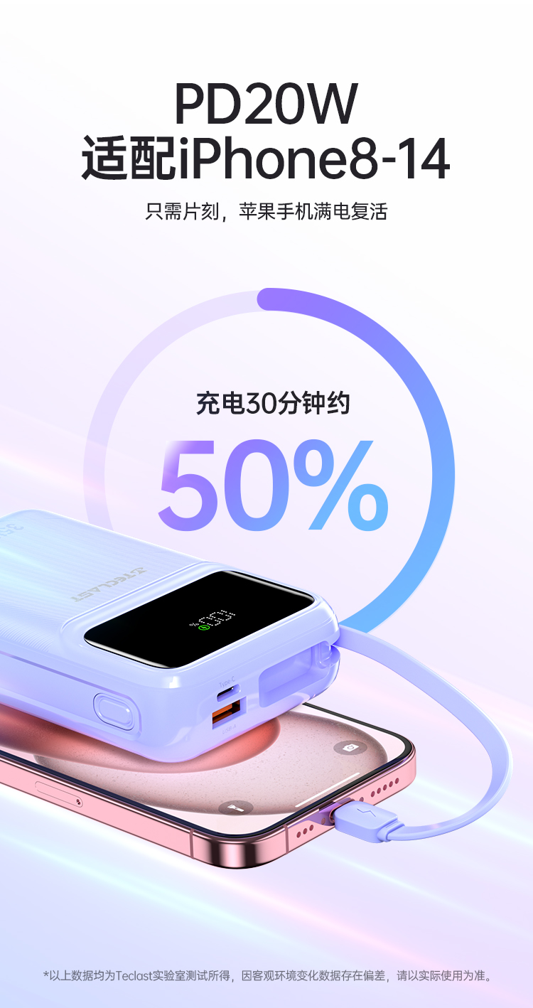 除了容量和快充功能,臺電 Teclast Q20 Pro 還自帶了一條 Type-C 線和一條 Lightning 線,適用于蘋果 iPhone 6~16 以及安卓設備。這意味著你無需再為不同設備準備不同的充電線,就可以為你的所有設備充電,數字顯示屏也是這款移動電源的一個實用功能。你可以隨時查看剩余電量,了解移動電源的使用情況,避免在關鍵時刻出現(xiàn)電量不足的情況。