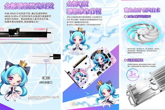外觀上,純白PC導(dǎo)風(fēng)罩融合定制白晝旋光鍍層,陶瓷般的細(xì)膩質(zhì)感搭配表面硬化層,耐磨抗老化,流線型設(shè)計(jì)取代了上代的棱角分明,更顯精致。合金背板有效加固顯卡,防止變形延長壽命,Q 版璦珈形象搭配鮮艷糖果配色,萌趣十足,與正面簡約白外觀完美契合。散熱方面,聚風(fēng)環(huán)形扇葉與優(yōu)化散熱模塊確保穩(wěn)定散熱,第四代流體力學(xué)滾珠風(fēng)扇更符合空氣力學(xué),相較上一代風(fēng)量提高 18%、風(fēng)壓提高 4%,同等轉(zhuǎn)速下噪音更低。更貼心的是,550W 以上電源即可支持運(yùn)行,進(jìn)一步降低入門門檻。