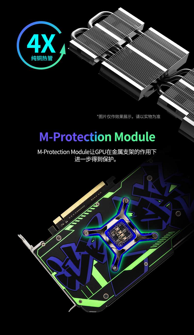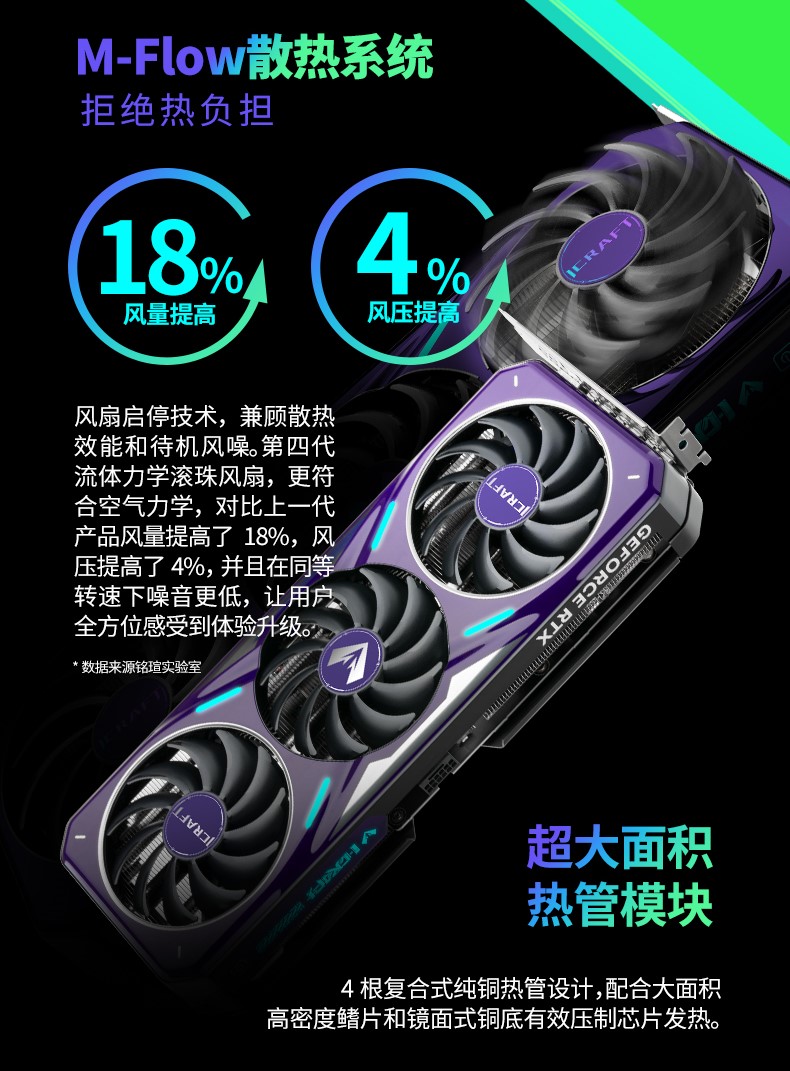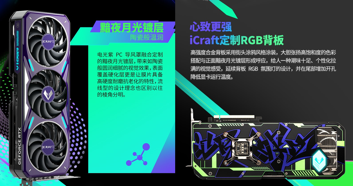 外觀上,這款顯卡潮味十足,打破了傳統(tǒng)顯卡棱角分明的刻板印象。電光紫 PC 導(dǎo)風(fēng)罩與定制黯夜月光鍍層巧妙融合,呈現(xiàn)出陶瓷般圓潤細(xì)膩的質(zhì)感,表面覆蓋的硬化層不僅讓顏值更持久,更賦予了膜片高硬度、耐磨、抗老化的實(shí)用屬性。流線型的設(shè)計理念讓顯卡整體更顯靈動,而高強(qiáng)度合金背板則暗藏巧思 —— 街頭涂鴉風(fēng)格的涂裝大膽張揚(yáng),高飽和度的色彩與正面的黯夜月光鍍層形成鮮明呼應(yīng),個性化直接拉滿。更貼心的是,背板延續(xù)了 RGB 氛圍燈設(shè)計,還在尾部增加了散熱開孔,既讓燈光效果更具層次感,又能輔助散熱,做到 “顏值與實(shí)力并存”。
