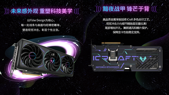 除了強(qiáng)悍的性能,銘瑄GeForce RTX 5070 Ti iCraft OC16G在特色設(shè)計(jì)上也頗具亮點(diǎn)。外觀設(shè)計(jì)上延續(xù) iCraft 系列硬核電競風(fēng)格,以 Flow Design 為核心設(shè)計(jì)理念,每一處線條與曲面都經(jīng)過精密雕琢,科技感與視覺沖擊力拉滿,高品質(zhì)金屬背板上的多色絲印工藝質(zhì)感十足,尾部特意增加的開孔設(shè)計(jì),既保障了通風(fēng)散熱,又能有效保護(hù)鰭片,讓顯卡在機(jī)箱中不僅是性能擔(dān)當(dāng),更是彰顯個(gè)性的顏值焦點(diǎn)。
