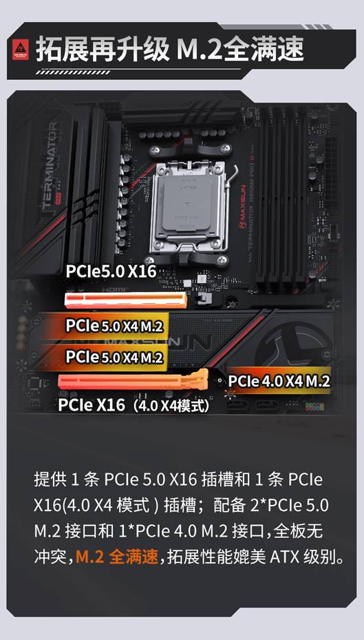相對比一代,二代新品主板在拓展和網(wǎng)絡(luò)方面都進行了升級。拓展方面,主板提供2個 PCIe 5.0 X4 M.2接口和1個 PCIe 4.0 X4 M.2接口,全部支持NVMe協(xié)議,M.2全滿速!同時還配備1條PCIe 5.0 X16插槽(位于第一槽位,對小尺寸機箱安裝更友好)和1條PCIe X16(4.0 X4模式)插槽,全板無沖突,拓展性能媲美ATX級別。