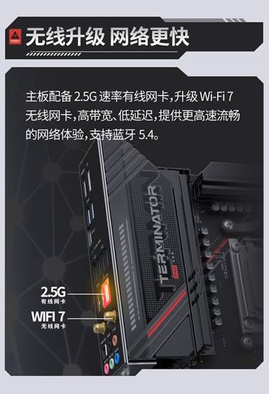 網(wǎng)絡(luò)方面,主板升級到WiFi 7無線網(wǎng)卡,支持藍牙5.4,有線方面則配備 Realtek RTL8125D 2.5G 高速網(wǎng)卡。無論是有線還是無線,都能提供高帶寬、低延遲的網(wǎng)絡(luò)環(huán)境,為在線學習、高清直播、高速下載和競技游戲帶來流暢穩(wěn)定的連接體驗。
