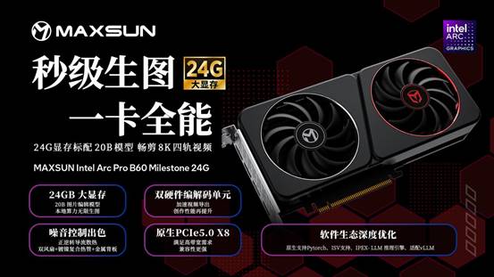 無論是追求秒級生圖、流暢剪輯的內(nèi)容創(chuàng)作者,還是追求更強(qiáng)悍AI性能、需要搭建多卡同步運(yùn)算環(huán)境的高階算力用戶,銘瑄 Intel Arc Pro B60系列顯卡都提供了值得信賴的解決方案。24G版本的MAXSUN Intel Arc Pro B60 Milestone 24G顯卡以高性價比助力靈感實(shí)時落地,雙GPU 48G版本的MAXSUN Intel Arc Pro B60 Dual 48G Turbo則以雙芯充沛算力勝任更高階的AI推理與開發(fā)任務(wù)。想要體驗(yàn)全新流暢創(chuàng)作之旅,或構(gòu)建本地AI算力平臺的用戶,歡迎前往銘瑄京東自營旗艦店了解更多詳情與選購!