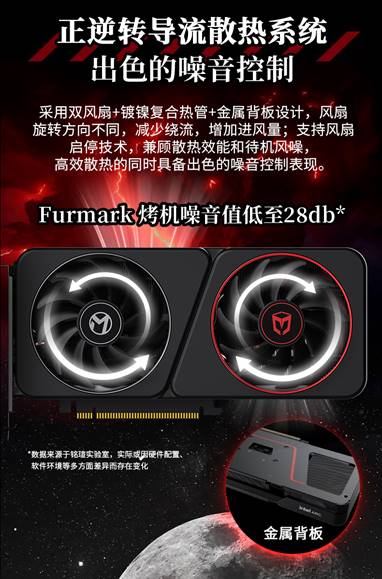 在散熱與靜音方面,該卡采用了正逆轉(zhuǎn)導(dǎo)流散熱系統(tǒng),配備雙風(fēng)扇、鍍鎳復(fù)合熱管與金屬背板,在確保高性能持久釋放的同時,將運(yùn)行噪音控制在低水平,讓創(chuàng)作過程更專注。