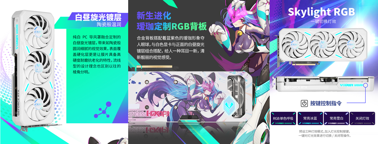 不僅性能能打,這款顯卡的外觀上設(shè)計清新亮眼,純白PC導風罩融合定制白晝旋光鍍層,觸感如陶瓷般圓潤細膩,定制璦珈合金背板上的藍紫色璦珈形象靈動吸睛,與正面鍍層相得益彰,為主機增添一抹清新亮眼的格調(diào)。更貼心配備一鍵燈光控制鍵,玩家可隨心切換燈效,讓柔和光影與《天國:拯救 2》的中世紀復古風格碰撞出獨特火花,打造專屬電競氛圍。