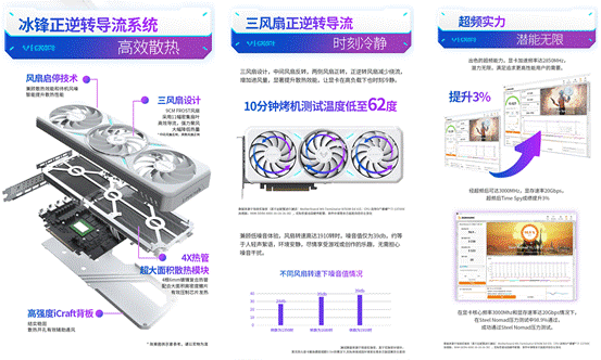 在顯卡性能日益強(qiáng)化的今天,散熱效能在一定程度上決定著硬件潛力的釋放程度。MAXSUN Intel Arc B580 iCraft 12G顯卡采用正逆轉(zhuǎn)導(dǎo)流散熱設(shè)計,相鄰風(fēng)扇旋轉(zhuǎn)方向不同,大幅減少氣流干擾,提升散熱效率,溫度更低,噪音更低。其搭載4根6mm鍍鎳復(fù)合熱管,配合高密度鰭片矩陣和三風(fēng)扇正逆轉(zhuǎn)導(dǎo)流散熱,在10分鐘Time Spy烤機(jī)測試中,溫度僅為62℃。無論是連續(xù)數(shù)小時鏖戰(zhàn)《三角洲》,還是高強(qiáng)度運(yùn)行 3A 大作、處理 4K 渲染任務(wù),它都能始終保持 “冷靜輸出”,告別因過熱導(dǎo)致的降頻卡頓。