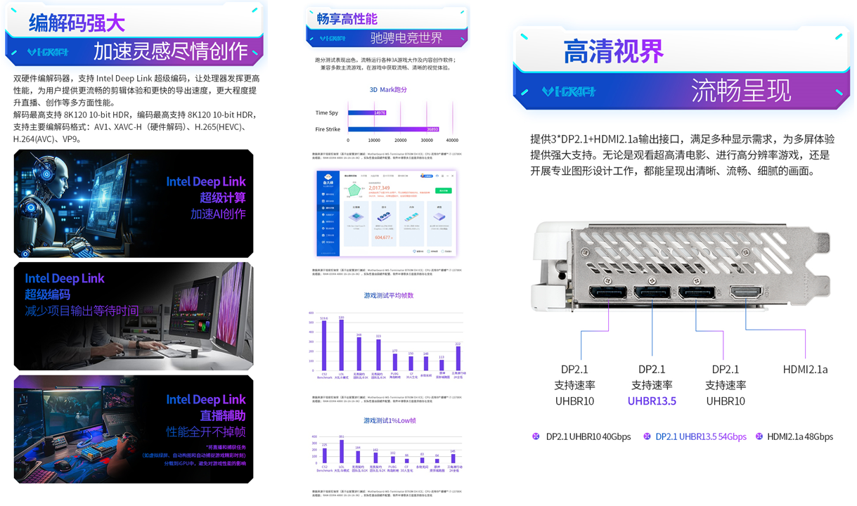 MAXSUN Intel Arc B580 iCraft 12G 顯卡不僅是游戲利器,更是兼顧多場景需求的全能選手。接口方面,提供3個DP2.1和1個HDMI2.1a輸出接口,多屏體驗(yàn)、高清視覺盡在掌握。此外,它的編解碼能力也十分卓越,雙硬件編解碼器支持AV1、H265和H264等主流編解碼格式,還支持了HAVC-H解碼,不僅能為游戲直播提供清晰流暢的畫面輸出,更能為專業(yè)攝影剪輯帶來高效體驗(yàn),兼顧游戲與創(chuàng)作雙重需求。