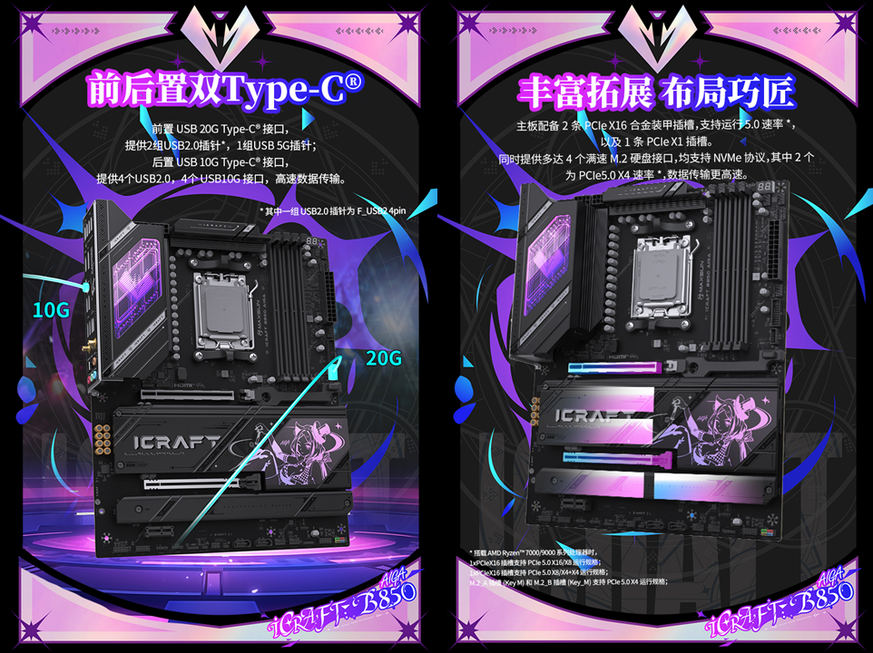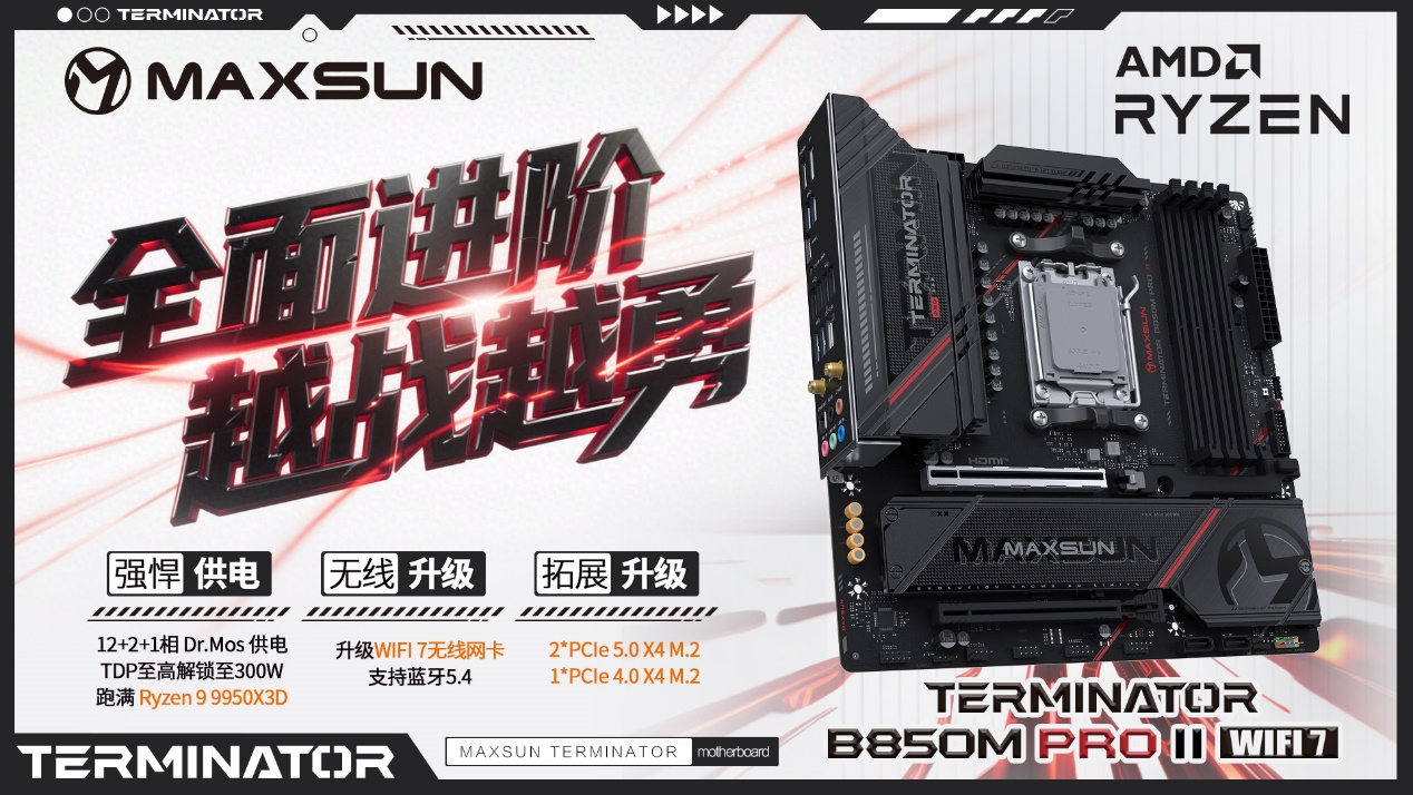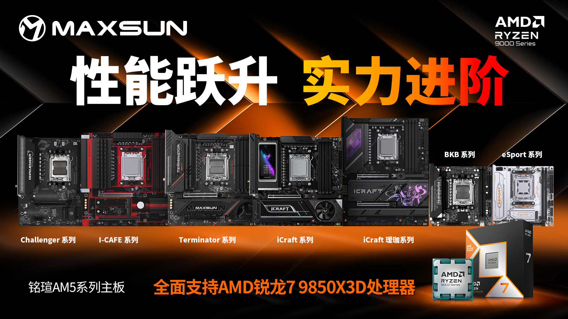 作為 AMD的核心合作伙伴,銘瑄 AM5 全系列主板全面支持AMD銳龍 7 9850X3D 處理器,助力玩家暢玩游戲,續(xù)寫性能傳奇。在眾多優(yōu)秀產(chǎn)品中,銘瑄iCraft B850 AIGA 與 銘瑄Terminator B850M PRO II WIFI7 兩款明星主板格外引人注目。它們分別以二次元顏值旗艦與高性價比戰(zhàn)力標(biāo)桿的鮮明定位,為不同需求的玩家量身打造適配 AMD 銳龍 7 9850X3D 處理器的黃金方案,讓每一分性能潛力都能盡情釋放。