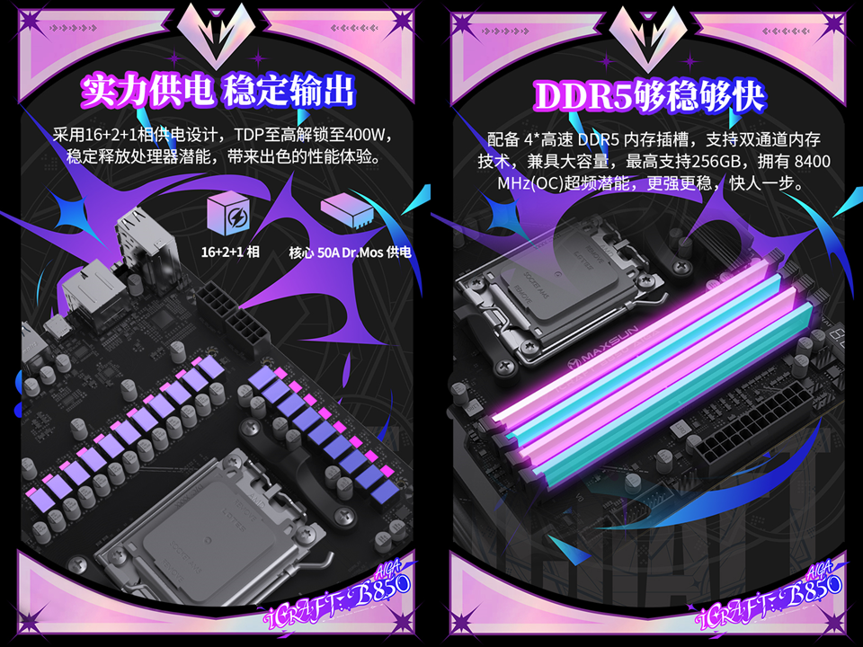 如果說AMD銳龍 7 9850X3D 處理器是性能核心,那銘瑄iCraft B850 AIGA主板就是為其量身定制的 “魔法戰(zhàn)甲”。它將二次元美學(xué)與旗艦級硬件規(guī)格深度融合,讓裝機(jī)不僅性能強(qiáng)悍,顏值更是賞心悅目,成為顏值黨與硬核玩家共同追捧的心頭好。