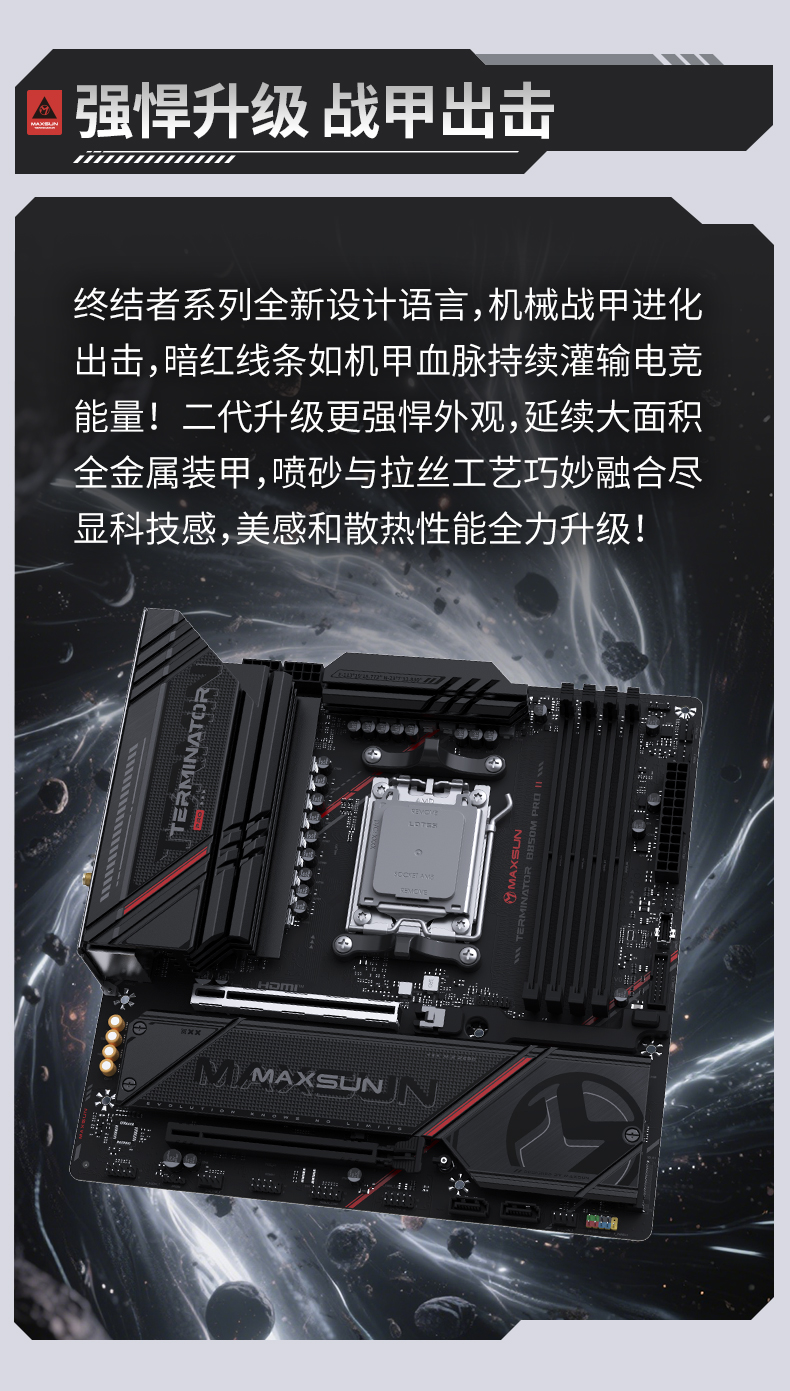 銘瑄Terminator B850M PRO II WIFI7 主板的外觀設(shè)計延續(xù)了終結(jié)者系列的硬核風(fēng)格,機(jī)械戰(zhàn)甲般的散熱裝甲上,暗紅線條如機(jī)甲能量脈絡(luò)貫穿始終,大面積全金屬裝甲融合噴砂與拉絲工藝,既增強(qiáng)了散熱性能,又帶來具有沖擊力的視覺科技感,無論放入任何機(jī)箱中都能成為焦點(diǎn)。