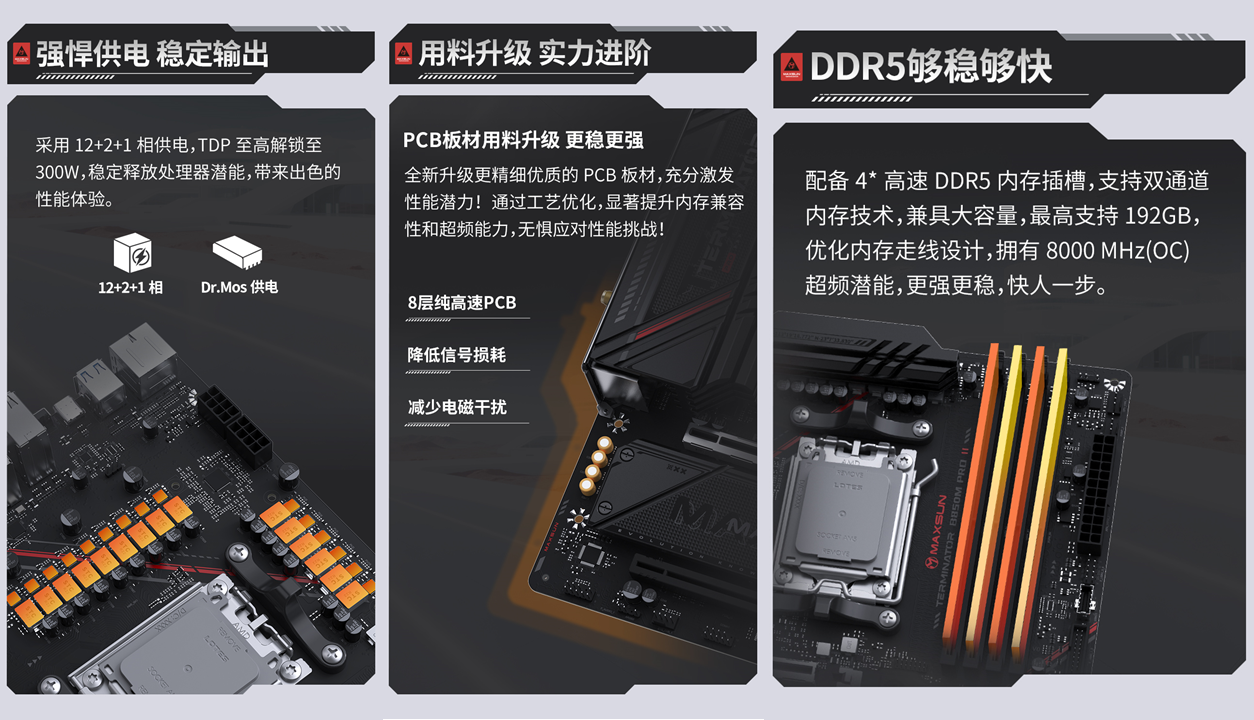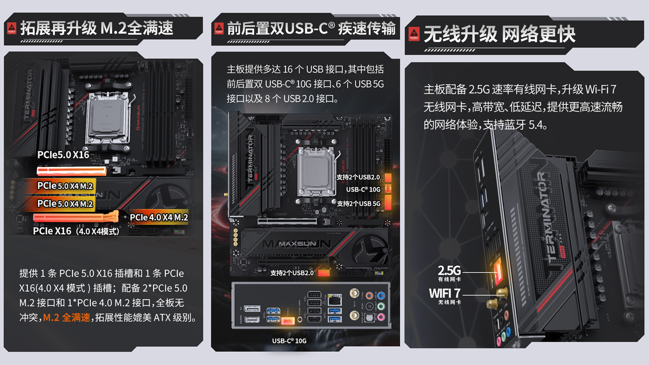 該主板在拓展和網(wǎng)絡(luò)方面還進(jìn)行了升級,主板提供2 個 PCIe 5.0 X4 M.2 接口與 1 個 PCIe 4.0 X4 M.2 接口,全部支持 NVMe 協(xié)議,實(shí)現(xiàn)M.2全滿速傳輸。同時配備1 條 PCIe 5.0 X16 插槽與 1 條 PCIe X16(4.0 X4 模式)插槽的配置,全板無沖突,拓展性能媲美 ATX 級別,能輕松滿足多設(shè)備連接、多場景使用的需求。網(wǎng)絡(luò)體驗迎來跨越式升級,原生搭載的 Wi-Fi 7 無線網(wǎng)卡配合 Realtek RTL8125D 2.5G 高速有線網(wǎng)卡,支持藍(lán)牙 5.4,高帶寬、低延遲的網(wǎng)絡(luò)傳輸,讓AMD銳龍 7 9850X3D 處理器在在線游戲、高清直播、高速下載等場景中都能流暢無憂,盡情發(fā)揮性能。