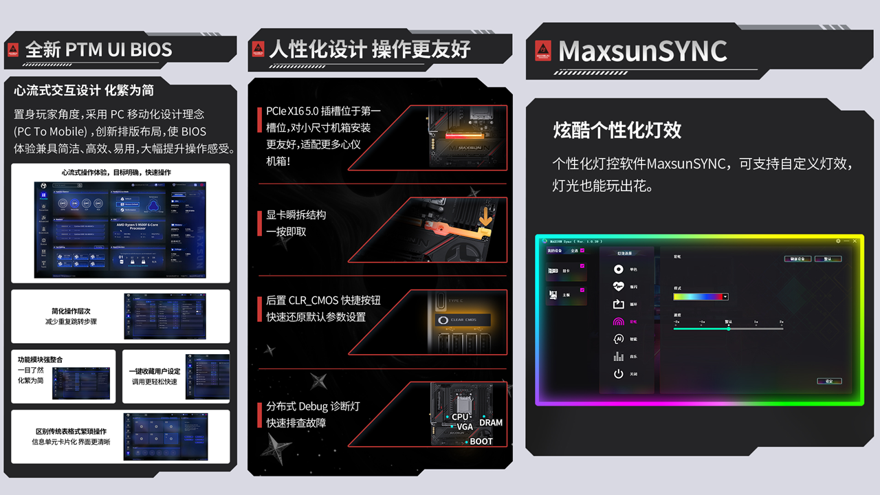 操作便捷性上,銘瑄 Terminator B850M PRO II WIFI7 主板同樣下足了功夫。全新的 PTM UI BIOS 打破傳統(tǒng)操作門檻,采用手機(jī)端般的卡片式界面設(shè)計,所有交互層級不超過 2 層,新手也能輕松上手調(diào)校系統(tǒng),快速優(yōu)化AMD銳龍 7 9850X3D 處理器的運(yùn)行狀態(tài);而顯卡瞬拆結(jié)構(gòu)、分布式 Debug 診斷燈和 CLR_CMOS 快捷按鈕等貼心設(shè)計,讓裝機(jī)過程更簡單,故障排查更高效,大大降低了使用門檻。此外,個性化燈控軟件 MaxsunSYNC 可支持自定義燈效,單色、音樂律動等多種模式隨心選擇,讓燈光也能玩出獨(dú)特個性,滿足玩家的個性化需求。
