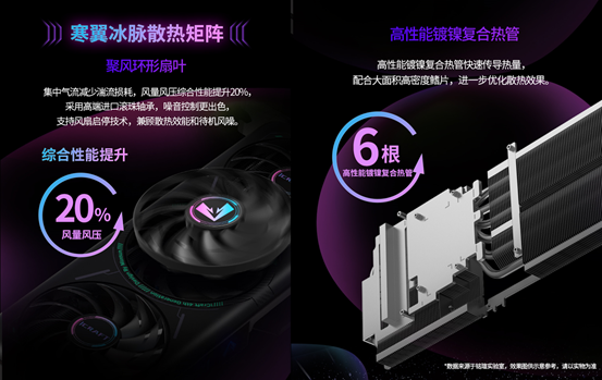 強(qiáng)悍性能的背后,離不開冷靜可靠的散熱保障。銘瑄為這款顯卡量身打造了寒翼冰脈散熱矩陣,聚風(fēng)環(huán)形扇葉能集中氣流、減少湍流損耗,風(fēng)量風(fēng)壓綜合性能提升 20%,搭配高端進(jìn)口滾珠軸承,噪音控制更為出色;高性能鍍鎳復(fù)合熱管快速傳導(dǎo)熱量,搭配大面積高密度鰭片,進(jìn)一步優(yōu)化散熱效果。配合風(fēng)扇啟停技術(shù),低負(fù)載時(shí)風(fēng)扇休眠靜音省電,高負(fù)載時(shí)即刻滿負(fù)荷運(yùn)轉(zhuǎn)強(qiáng)效散熱,即便在《惡意不息》四人聯(lián)機(jī)長時(shí)間鏖戰(zhàn)的高負(fù)載場景下,也能保持穩(wěn)定運(yùn)行,性能不打折。